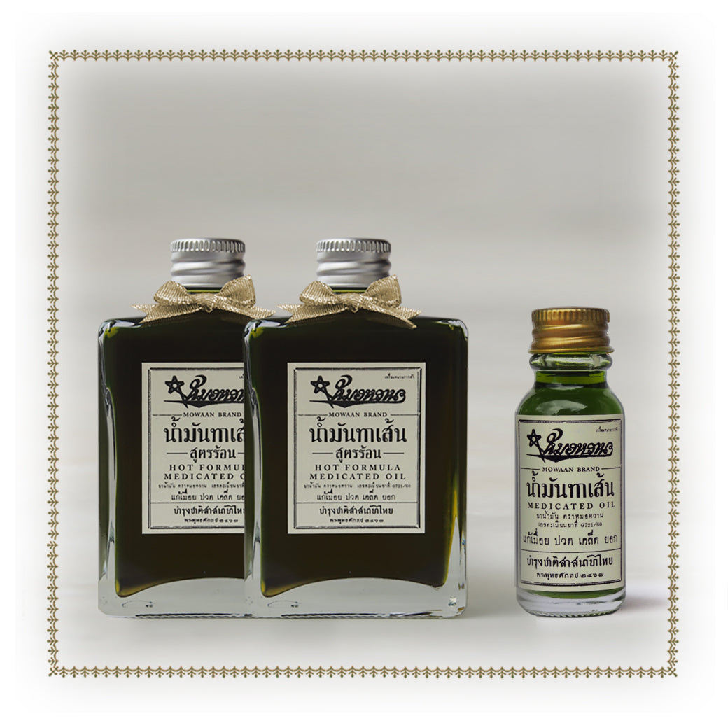 น้ำมันทาเส้น ๕๐ มล. สูตรร้อน ๒ ขวด + สูตรดั้งเดิม ๑๕ มล. ๑ ขวด